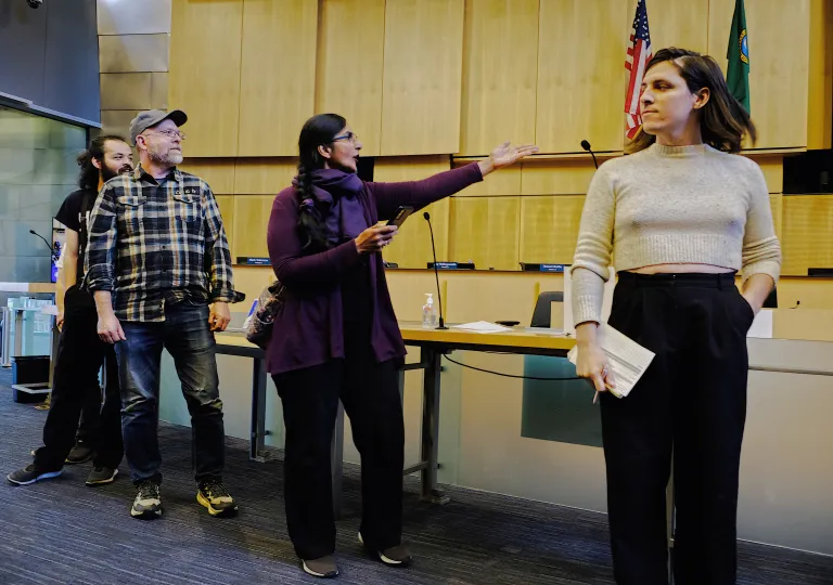 Each time the Councilmembers slunk out of the room, WSB members took over the council chambers and turned it into a public meeting. Kshama stood up in front to talk about strategy for our movement, to announce the next monthly WSB meeting, appeal for people to become WSB members, and to talk about next steps in the fight.